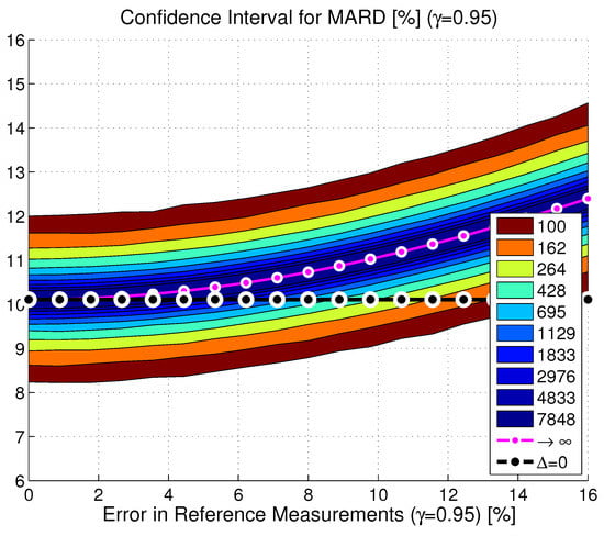 and are the main variables that can be easily controlled in the study design phase of clinical trials designed for assessing CGM performance. As can be seen earlier in this subsection, they have a huge impact on the reliability of the resulting MARD values. Therefore, and should be controlled in order to obtain MARD values that actually reflect CGM performance. In order to facilitate this, the so-called MARD reliability index (MRI) was introduced in [28]. The MRI is defined as the width of the symmetrical CI around (in %) that includes of MARD values: