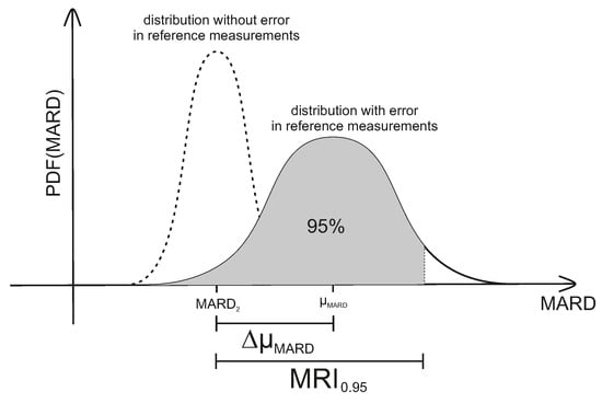 with the probability density function (PDF) of MARD values. MRI thus corresponds to an upper bound for the estimate of error in MARD as from a clinical trial (taking into account the effect of number and uncertainty of reference measurements). An illustration of MRI can also be seen in Figure 7 below. For the case of a very high accuracy of the reference measurement system, the probability of obtaining a given value of MARD is centered around —the value corresponding to a very high number of measurements. This is shown on the left side of Figure 7. Increasing the number of paired points will narrow the PDF. An infinite number of paired points would of course deliver exactly . Adding the effect of the error of the reference system leads to the solid curve on the right side of Figure 7. Note that this curve is no longer centered around , but is displaced by the average value of the error of the reference system towards higher MARD values ( in Figure 7).