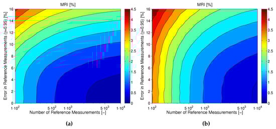 As explained earlier in this subsection, the uncertainty in MARD not only depends on and , but is also influenced by the CGM performance itself. This also becomes evident for the results shown in Figure 8. In this figure, the MRI is shown for CGM2 (plot A) and CGM3 (plot B) of dataset [15] as computed based on the results of the Monte Carlo simulations presented earlier in this subsection. It can be seen how the effects of number and uncertainty of reference measurements look different for the two devices: whereas for CGM2 (with a relatively good measurement performance) the choice of the reference method is very important, for CGM3 (with an inferior measurement performance) a sufficiently high number of paired points is more important.