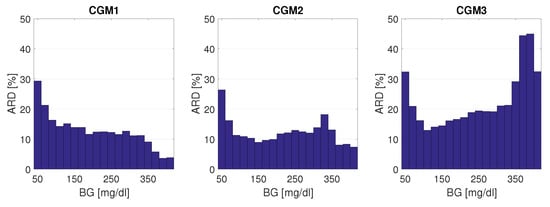 For the results displayed here, the data from [15] and the estimates for the continuous BG traces (see Section 2) were used. The continuous BG traces allow a reference value to be assigned to each CGM measurement. If all these points are used, the best approximation of the “real” MARD in terms of number of paired points can be computed. Since the estimates of the continuous BG traces are used, the error in the reference measurement system can be neglected in these computations. The resulting MARD values for therefore corresponded to and were lower than the MARD values stated in [15]. For example, for CGM2 a of % was calculated, whereas in [15] a MARD of % is stated.