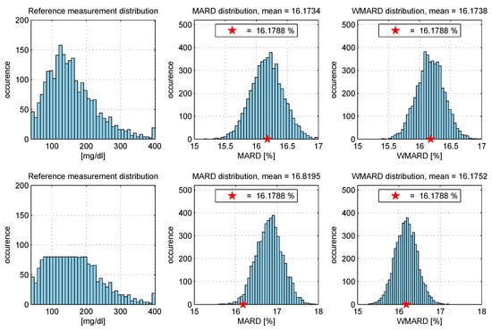 In this subsection, only the effect of the number of reference measurements and the error in the reference measurements on MARD are studied. Parts of these results have already been presented in [28]. Comparisons are made with respect to (i.e., the MARD for and for ). This value was estimated for the data from [15] by using the continuous BG traces calculated using the method from [44] for obtaining the reference measurements. It is assumed here that the BG distribution corresponded to the representative one (, see Section 3.2.2 for details). Furthermore, the effect of the CGM time delays are not considered separately in this subsection (see Section 3.1 for more details on this topic).