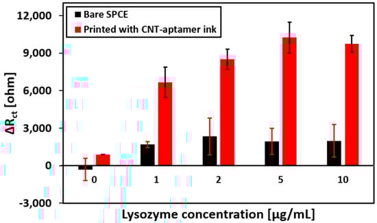 Change of charge transfer resistance (Rct) due to lysozyme exposure to bare SPCE (black bars) and printed SPCE (red bars) for different lysozyme concentrations.
