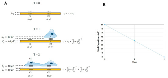 Diagrammatic description of ECIS-Zθ capacitance theory. (A) The attachment and cell growth over an ECIS electrode over time. At T = 0 the total capacitance (CT) of the system is equal to the sum of the electrode capacitance (Ce) in parallel. As cells progressively adhere to the surface electrodes, an increasing proportion of CT is represented by the cell-electrode capacitance (Cc). The cell-electrode capacitance can be interpreted as capacitors connected in series; (B) Graphical representation of the change in total capacitance over time, as cells adhere to and cover exposed electrode areas.