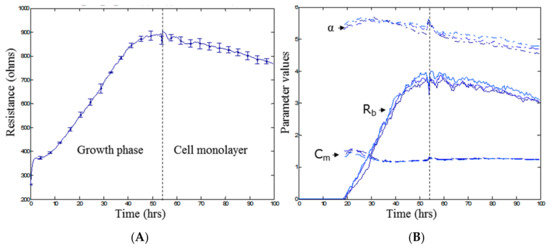 Monitoring parameters R (Ω), Rb (Ω cm2), α (Ω0.5 cm), and Cm (µF/cm2). (A) Time course of resistance magnitude at 4000 Hz for endothelial cells. Influence of the cell growth phase and formation of a cell monolayer on resistance; (B) Time course of modelled parameter magnitudes. Illustration of the changes in the three parameters Rb, α, and Cm as a result of cell growth and monolayer formation as can be seen by an increase in Rb overtime. Time point 0 h denotes the time at which cells were seeded at 20,000 cells per well. Data (A) show the mean ± SD (n = 3 wells) of one independent experiment representative of three experimental repeats.