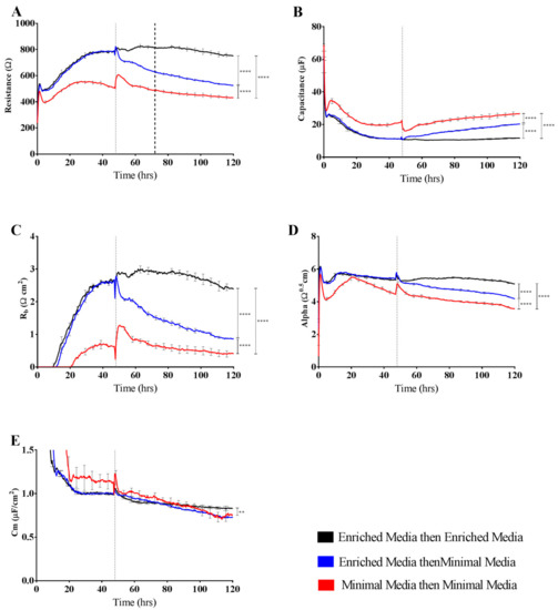 Resistance and modelled parameters Rb, α, and Cm of brain endothelium grown in either Enriched Media or Minimal Media. Endothelial cells were seeded at 20,000 cells per well on a 96w20idf ECIS array. Time 0 h denotes the time cells were seeded. The dotted vertical line indicates 48 h of cell growth in each respective media type, with a subsequent media change carried out at this time. (A) Resistance at 4000 Hz trace over 120 h of cell growth; (B) Raw capacitance trace over 120 h of cell growth; (C) Modelled parameter, Rb, trace over 120 h of cell growth; (D) Modelled parameter, α, trace over 120 h of cell growth; (E) Modelled parameter, Cm, trace over 120 h of cell growth. Data show the mean ± SD (n = 3 wells) of one independent experiment representative of three experimental repeats. Graphical representations of p values are * p ≤ 0.05, ** p ≤ 0.01, *** p ≤ 0.001, **** p ≤ 0.0001.