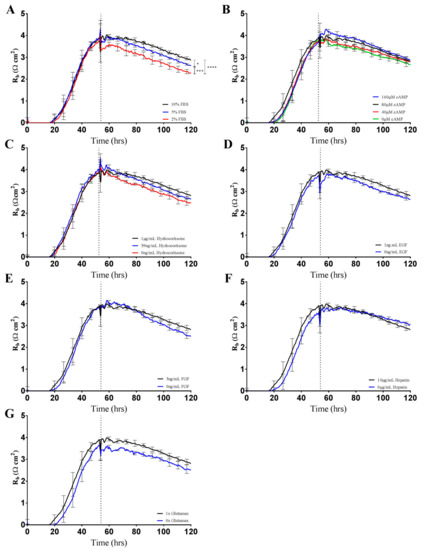 Changes in Rb as a consequence of altering growth medium components as shown by brain endothelium. Endothelial cells were seeded at 20,000 cells per well on a 96w20idf ECIS array. Time 0 h denotes the time cells were seeded. The dotted vertical line indicates 48 h of cell growth in each respective media type, with a subsequent media change carried out at this time. (A) Brain endothelium grown in Enriched Media containing either 10%, 5%, or 2% FBS; (B) Brain endothelium grown in Enriched Media containing either 160 µM, 80 µM, 40 µM, or 0 µM cAMP; (C) Brain endothelium grown in Enriched Media containing either 1 µg/mL, 39 ng/mL, or 0 ng/mL hydrocortisone; (D) Brain endothelium grown in Enriched Media containing either 1 ng/mL or 0 ng/mL EGF; (E) Brain endothelium grown in Enriched Media containing either 3 ng/mL or 0 ng/mL FGF; (F) Brain endothelium grown in Enriched Media containing either 10 µg/mL or 0 µg/mL heparin; (G) Brain endothelium grown in Enriched Media containing either 1× or no Glutamax. Data show the mean ± SD (n = 3 wells) of one independent experiment representative of three experimental repeats. Graphical representations of p values are * p ≤ 0.05, ** p ≤ 0.01, *** p ≤ 0.001, **** p ≤ 0.0001.