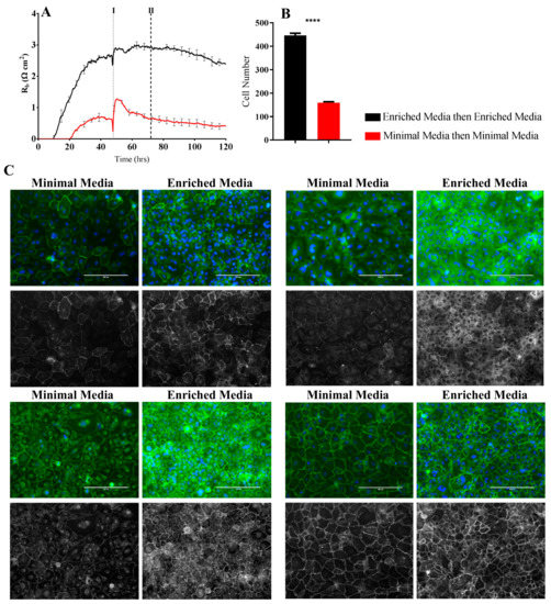 Figure 4 shows data from a simple paradigm of growing endothelial cells in different culture media and using ECIS technology to measure the subsequent resistance and barrier formation relative to each media. Resistance measurements taken at 4000 Hz revealed distinct differences in brain endothelial barrier function due to the different media. Medium enriched for growth factors, reputed barrier strengthening compounds, and serum (Enriched Media) resulted in the greatest resistance measurements of ~800 Ω (Figure 4A). Conversely, the removal of the growth factors hEGF and hFGF as well as a reduction in serum concentration in the Minimal Media (red curves) showed a significantly reduced resistance, plateauing around 500–550 Ω. To determine if the changes seen in overall resistance between Enriched Media and Minimal Media were a consequence of changes occurring during the growth phase, cells were grown in Enriched Media until a barrier had formed (~48 h; first dashed line) and then media was removed and replaced with Minimal Media (Figure 4A). An immediate reduction in barrier resistance was observed within 2 h of the change, with the disruption in the endothelial barrier maintained thereafter. Collectively, this suggests that the optimal growth, barrier forming, and sustaining conditions for brain endothelial cells require a combination of growth factors, mitogens, and specific barrier strengthening compounds such as cAMP and hydrocortisone (as present in the Enriched Media).