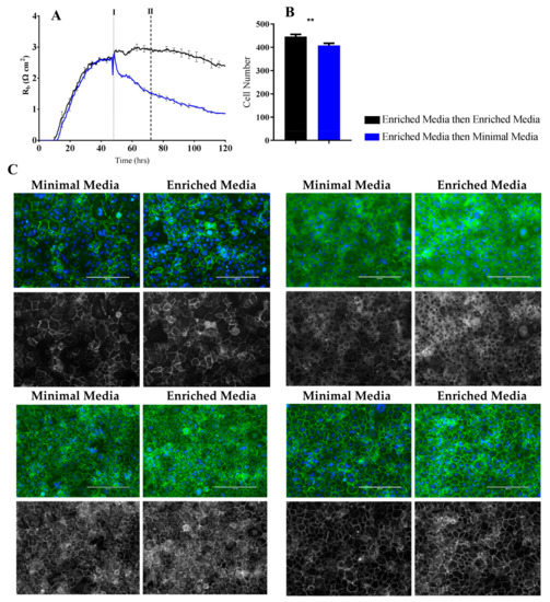 Mathematical modelling of the resistance measurements was conducted to determine the contribution of the paracellular barrier (Rb), basal attachment (α), and cell membrane (Cm) to the observed changes. Contributing significantly to the differences in barrier resistance between Enriched Media and Minimal Media are the disparities in paracellular resistance Rb (Figure 4C). Endothelial cells cultured in Enriched Media show Rb values consistent with what we have observed previously, as per Kho et al. [12]. However, removal of the growth-inducing compounds significantly impairs these interactions, leading to a much weaker paracellular barrier (Rb). Also notable is the delayed formation of Rb for the cells grown in the Minimal Media. Most striking is the rapid loss of paracellular barrier (Rb) when the cells are switched from Enriched to Minimal Media. The modelled parameter α, which indicates the strength of interaction with the basal substrate, is slightly affected by the Minimal Media but to a much lesser degree than Rb (Figure 4D). In contrast, Cm, which is indicative of temporal alterations in membrane thickness and composition, is not affected by growth in either Enriched or Minimal Media (Figure 4E). As Cm measurements are used to determine if changes in capacitance are solely due to changes in electrode coverage or are a function of micro changes in apical membrane structures, the interpretation from the data is that Minimal Media likely affects electrode coverage and not membrane structure. The temporal nature of ECIS and modelling is powerful in revealing these responses.