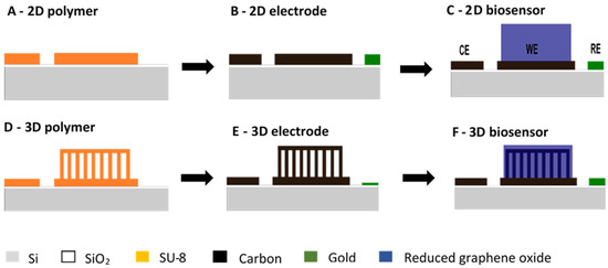Schematic of 2D (A–C) and 3D (D–F) carbon biosensor fabrication: (A,D) polymer precursor template fabricated by multiple UV photolithography processes with the negative epoxy photoresist SU-8; (B,E) pyrolytic carbon fabricated by pyrolysis of the corresponding polymer precursor template; (C,F) functionalization of WE with reduced graphene oxide.