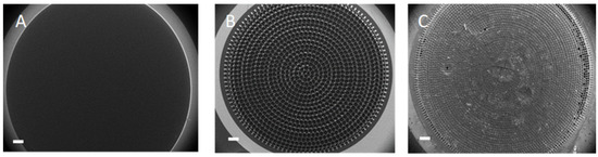 The 2D and 3D carbon microelectrodes for enzyme-based electrochemical biosensing were fabricated as reported previously in references [20,30]. Figure 2A,B shows the fabricated 2D and 3D carbon electrodes, while Figure 2C shows the 3D electrode after drop casting of the graphene oxide. The thickness of the 2D pyrolytic carbon electrodes was 2.1 µm, which is considerably lower than the initial thickness of the SU-8 films due to shrinkage during pyrolysis. Similarly, the height of the 3D pyrolytic carbon structures decreased to 44 µm. The 3D microelectrodes consisted of pillars with a diameter of 6.7 µm and pitch of 50 µm. The suspended layer on the top of the pillars had holes with a diameter of 29 µm and pitch of 50 µm. The WE diameter was 4 mm. The surface area of the bare 3DCMEs was approximately twice the surface area of the 2D electrode [30].