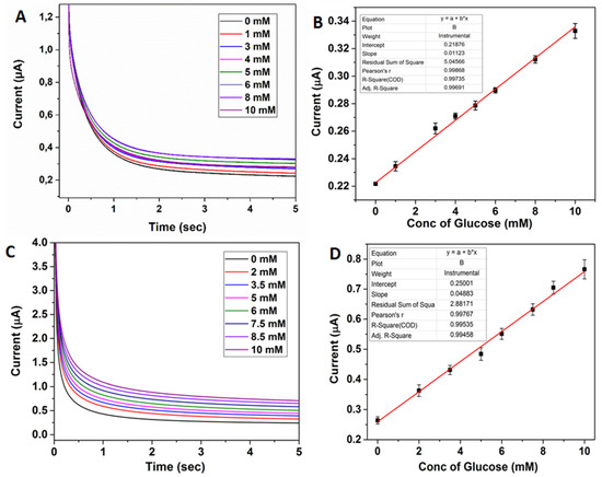 (A) Chronoamperometric sensing of glucose (0–10 mM) with 2D/RGO-PEI/GOx pyrolytic carbon electrodes in 10 mM PBS (pH 7) (B) Corresponding calibration plot obtained from concentration of glucose vs. current at 4 s. (C) Chronoamperometric sensing of glucose (0–10 mM) with 3D/RGO-PEI/GOx pyrolytic carbon electrodes in 10 mM PBS (pH 7) (D) Corresponding calibration plot obtained from concentration of glucose vs. current at 4 s.
