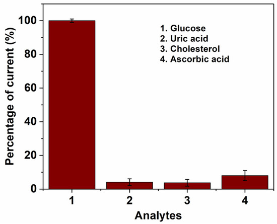 In order to evaluate a realistic application of the 3DCMEs coated with RGO, the selectivity of the sensor towards some common electroactive species existing in human blood samples, such as cholesterol, ascorbic acid and uric acid, was studied (Figure 5). As seen from the amperometric measurement with GOx, no significant interferences from these compounds were observed. Furthermore, the negatively charged polymer (Nafion®) improves selectivity by repelling the uric acid and ascorbic acid through electrostatic repulsion.