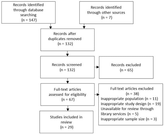 A strategic search was completed using the PubMed and Academic Search Complete databases employing the search terms “type 1 diabetes”, “T1D”, “insulin dependent diabetes mellitus”, “IDDM”, “juvenile diabetes”, “exercise or physical activity”, “continuous glucose monitoring”, and “sensor augmented pump or sensor augmented insulin pump or SAP”. Duplicate articles were removed, and the remaining articles were reviewed, first through assessing the title and abstract, and then more thoroughly by evaluating the full text after initial articles deemed inapplicable were removed. Figure 1 illustrates the procedure implemented to obtain literature. Studies were selected based on sample size and participant age. Studies including small sample sizes (n < 5), adolescents, pregnant women, individuals with type 2 diabetes, or which were described as “quasi experimental” were excluded. Upon completion of the search protocol, 29 articles were reviewed.