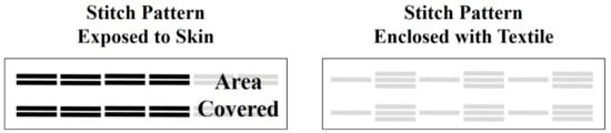 Stitch patterns for e-textile electrodermal activity (EDA) electrodes, where each e-textile electrode exposed to the surface of the skin covers 0.12 cm2 of surface area.