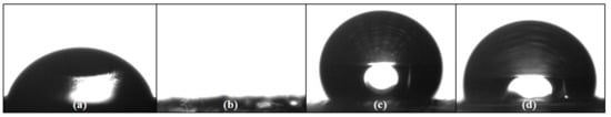 Optical images of water droplet on surfaces of (a) solid silver/silver chloride, as well as (b) cotton, (c) nylon, and (d) polyester textiles.