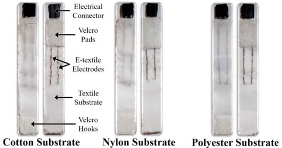 The integration of Ag/AgCl e-textiles with the textile substrates of cotton, nylon, and polyester proved to be a challenge and showed a success rate of approximately 50%. In particular, the connection between the solid electrical components and the conductive yarn was one of the more difficult aspects to accomplish successfully. In addition, since the e-textile EDA electrode straps were developed by hand, the tension of the stitched yarn was difficult to maintain, resulting in a decent amount of variation in the resistance between the electrical connector and the furthermost end of an e-textile electrode, which was on average 80.96 ± 26.53 Ω. The surface area covered under the e-textile electrodes, when added to the area in between e-textile electrodes, was approximately 1.04 cm2 for each of the e-textile EDA monitoring straps (see Figure 5 for cotton, nylon, and polyester e-textile EDA electrode strap prototypes). In comparison, the surface area covered under the standard electrodes, when added to the area in between the standard electrodes, was estimated to be 3.96 cm2.
