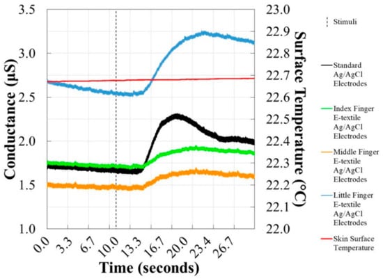 For the 4-h test, the EDA data recorded with a set of e-textile electrodes with a cotton textile substrate on the distal phalanx of the middle finger was compared to the EDA data collected by the standard electrodes on the proximal and medial phalanges of the middle finger (n = 1). One subject was used for all tests. The skin surface temperature was also monitored during all experiments with the use of a temperature sensor (Thought Technology, Montreal, QC, Canada).