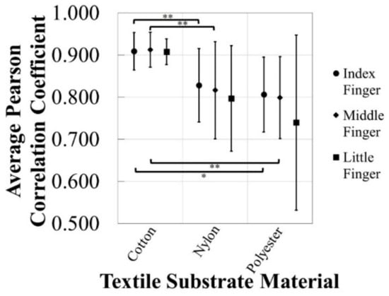 The average Pearson correlation coefficients for the comparison of the EDA stimulus responses of the rigid electrodes (1.50 cm distance, 1.00 cm2 surface area) to the signals of the e-textile electrodes of 0.12 cm2 surface area with distances of 0.40 cm integrated into cotton, nylon, and polyester textile substrates on the distal phalanx of the index, middle, and little finger on the palm of the hand. Standard deviations are shown and one-tailed t-test results with p-values < 0.05 (*) and p-value < 0.10 (**) are indicated. For each value n = 3.