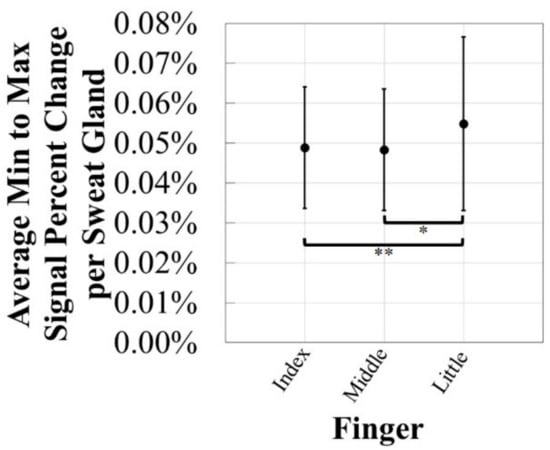 The average minimum to maximum EDA signal percent change per sweat gland for comparison of EDA waveforms from the distal phalanx of the index, middle, and little fingers on the palm. Standard deviations are shown and one-tailed t-test results with p-values < 0.05 (*) and p-value < 0.10 (**) are indicated. For each value n = 9.