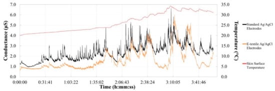 The Pearson correlation coefficients of the complete 4-h test were calculated to compare the EDA signals collected by the standard and e-textile electrodes, the EDA signal of the standard electrodes versus the skin surface temperature, as well as the EDA data recorded by the e-textile electrodes versus skin surface temperature. The EDA signals collected by the standard and e-textile electrodes showed a relatively high correlation coefficient of 0.746, considering the length of the test. The EDA data recorded by the standard electrodes also showed a relatively high correlation coefficient of 0.746 when compared to the skin surface temperature signal. A lower correlation coefficient of 0.569 was obtained when comparing the EDA signal measured by the e-textile electrodes and the skin surface temperature data. These results demonstrate a trend that the EDA signal recorded by standard electrodes are more correlated to the skin surface temperature signal than that of e-textile electrodes. Also, future research can explore these trends and should utilize a room with controlled temperature and humidity in order to allow for the repeatability of the testing conditions.