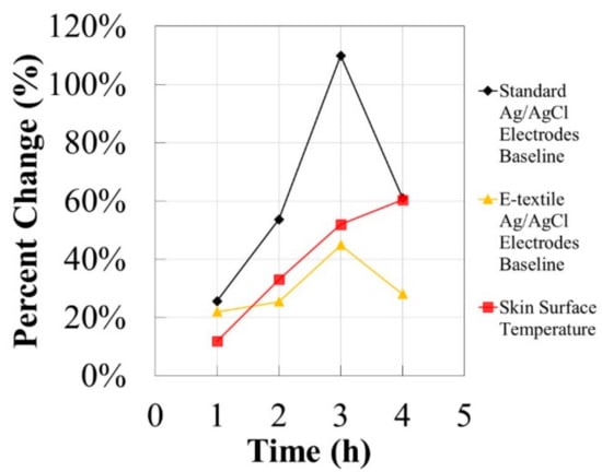 The EDA data recorded over 4 h with dry Ag/AgCl e-textile EDA electrodes integrated into a cotton textile substrate was compared to the EDA signal collected by dry standard solid Ag/AgCl electrodes. In addition, the EDA signals of both sets of electrodes were compared against the changing skin surface temperature. Figure 9 shows the EDA and temperature signals collected during the 4-h test. Importantly, the change in all signals was evaluated across the 4-h test to determine if there were observable trends with the data collected. The room, which had an open window, had a temperature and relative humidity at the beginning of the test to the end of approximately 23 °C and 26% to 30 °C and 17%, respectively. The signal percent difference of the skin surface temperature, standard electrode baseline EDA signal and e-textile baseline EDA signal from the beginning of the test and at each hour time point ± 10 min is presented in Figure 10. The trends observed indicate that the baseline EDA signal of the standard non-breathable and non-flexible electrodes is affected by the change in temperature more than the baseline EDA signal of the e-textile electrodes. Specifically, at the 4-h time point, it is observed that the skin surface temperature has increased by 60%, the baseline EDA of the standard electrodes has increased by 61%, while the baseline EDA e-textile electrodes increased by 28%. Similar results are also observed at other time points. At the 4 h time point shown in Figure 10, a decrease was observed in both EDA signals, but there was an increase in the skin surface temperature. These contrasting changes could be attributed to a physiological change in the EDA baseline signal that is not related to the skin surface temperature, since EDA is mainly a behavioral response.