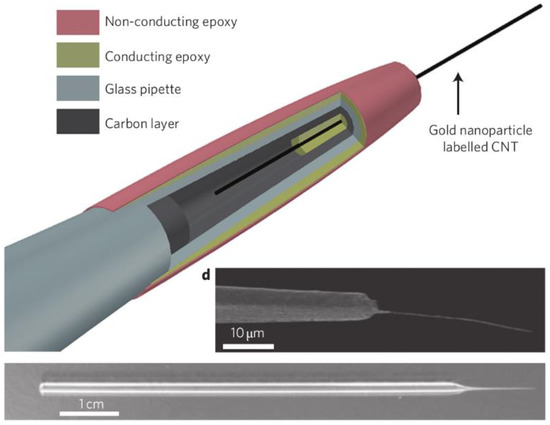 Nanoelectrode fabricated with a single carbon nanotube introduced in a glass pipette coated with conducting materials. Adapted with permission from [54] Copyright 2010 Nature Springer.