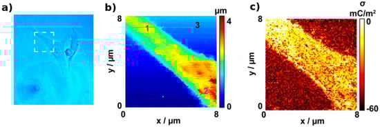 Simultaneous surface charge and topography of living cells have also been determined by nanoscale SICM. For instance, a bias modulated configuration was used to decouple the topographical and surface information allowing the quantitative imaging of nanoscale surface charge of Zea mays root hair and human adipocyte cells. This technique allowed seeing distinct local surface charge distributions across the surface of the cells due to the high spatial resolution provided by the nanoscale SICM tips and distance-control feedback method [115]. A potential-pulse chronoamperometric approach was employed with the previous system, which avoided the lock-in detection leading to an enhanced data acquisition rate. This strategy was employed for imaging of surface charge heterogeneities in neuron-like PC12 cells (Figure 3) under physiological conditions [116].