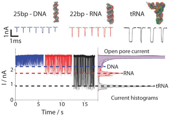 Stochastic current responses of translocation events of different DNA and RNA molecules. Shape and amplitude of the current responses were different and enabled the discrimination of the different molecules Adapted with permission from [200] Copyright 2010 Springer Nature.