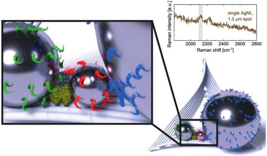 - Heck, C.; Kanehira, Y.; Kneipp, J.; Bald, I. Placement of Single Proteins within the SERS Hot Spots of Self-Assembled Silver Nanolenses. Angew. Chem. Int. Ed. 2018, 57, 7444–7447. [Google Scholar] [CrossRef] [PubMed]