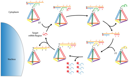 - He, L.; Lu, D.; Liang, H.; Xie, S.; Zhang, X.; Liu, Q.; Yuan, Q.; Tan, W. MRNA-Initiated, Three-Dimensional DNA Amplifier Able to Function inside Living Cells. J. Am. Chem. Soc. 2018, 140, 258–263. [Google Scholar] [CrossRef] [PubMed]