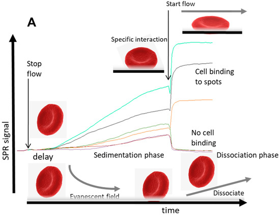 Below we will also try to explain the relevant mechanism for understanding the physical phenomena underlying cellular detection by SPR. In Section 1, the features of cells immobilized on a SPR sensor surface are summarized [10,11,12,13], including the responses to cellular morphology changes [14] and processes of apoptosis [15]. Additionally, it shows the potential for SPRi cytometry to measure the presence or absence of cell surface antigens on red blood cells (RBCs). Alternatively, SPRi cytometry is described for the ratio of the number of various cell membrane antigens [16]. In Section 3, we summarize a novel SPRi strategy that can be used to rank the avidity of ligands to cellular receptors or avidity of antibody-IgG-opsonized cells (red blood cells, RBCs) to IgG-Fc-receptors (FcγR). It also reveals the difficulty of getting the affinity constants for antibody binding to living cells. Finally, the SPRi cytometry field includes the monitoring of secretion of cellular products (e.g., antibodies) by living cells as described in Section 3.