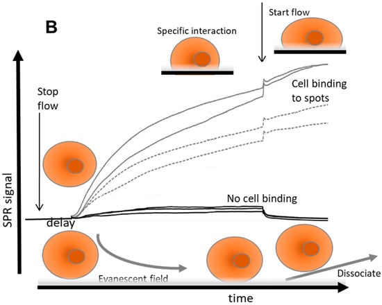 Principles of cellular SPR. (A) For nonadherent and rigid cells such as RBC and (B) for adherent cells. Generally, mammalian cells sediment and penetrate into the evanescent field and will be detected. The cell surface antigens will bind to specific ligands on the surface and will deform the cell. The signal depends on anchoring points of ligands with the cell. More anchoring points of ligand–cell surface antigens interactions allow that the cell penetrates deeper in the hydrogel of the sensor surface giving rise to higher SPR signals. Flow induces a force to cells and effectively deforms the cell and a larger part of the cell will be detected. This is reversible for rigid cells such as RBC in (A), but can lead to spreading in time and during exposure of the cells, a continuously increasing SPR signal occurs in (B) [30].