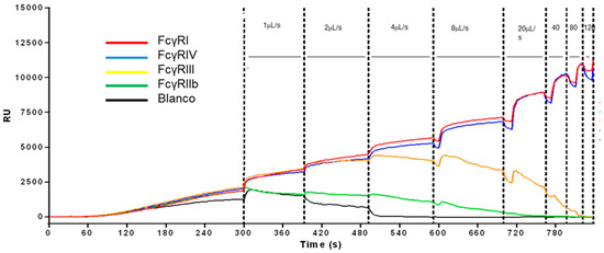 Affinity profiling using SPR. T/S sensorgram for label-free cell profiling measured in the IBIS MX96 (unpublished results). Red is FcγRI, blue is FcγRIV, orange is FcγRIII, green is FcγRIIb (all mouse), and black is blanco. Sedimented cells are subjected to an incremental increase in flow rate. When the drag forces of flow are too high, the cells will dissociate from the surface. RBCs will bind or dissociate dependent on the affinity and number of receptors (avidity). Increasing flow rate, stepwise (indicated by vertical dotted lines) from 1mL/s (at 300 s) up to 120mL/s, allows determining how well the cells bind to the spotted FcγRs. Avidity was determined by measuring the binding strength of mouse IgG2a-opsonized RBCs to c-terminally biotin tagged FcγR on a streptavidin sensor measuring binding to all mouse FcγR simultaneously for each antibody (n = 6).