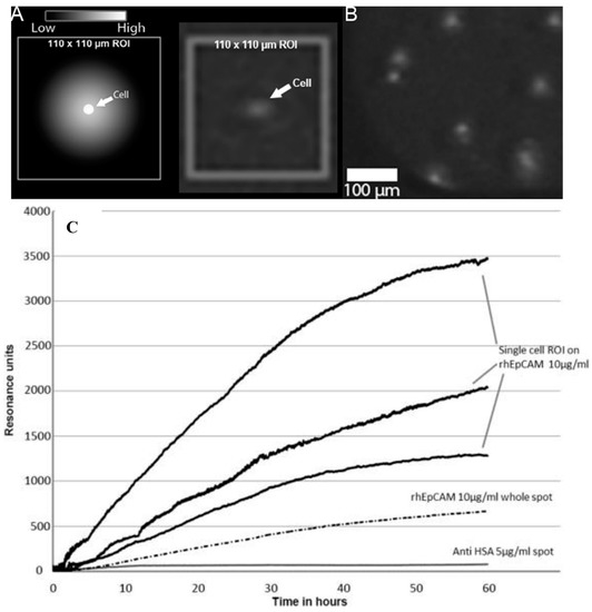Single-cell antibody secretion monitored with SPRi. Panel (A): Schematic representation of cell that secretes antibodies; the sensor surface captures the secreted molecules in a halo around the cell. Panel (B): SPR-image of VU1D9 cells on top of the sensor surface with secreted anti-EPCAM antibodies. Panel (C): SPR sensorgram showing the variation of single-cell production of anti-EpCAM by VU1D9 cells. Noise levels are high due to very small, 110 µm2 sized Regions of Interest. As a reference, anti-HSA and rhEpCAM whole spot averaged signals with large Region of Interests are shown. The signals were zeroed in order to compensate for the background.