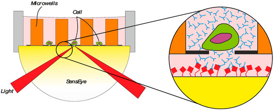 The principle of the McSPRinter. The microwell arrays with single cells is attached to a SPR sensor surface and immersed in cultivation medium. The product of the cells diffuses via the 1 µm membrane to the sensor surface. Reprinted from F. Abali et al. [44] Copyright 2017 with permission from Elsevier.