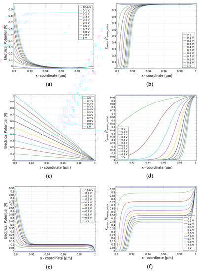 - In the case of no ion penetration inside the conductive polymer (Figure 2a,b) the main potential drop and reduction of PEDOT+ concentration occurs at the interface with the electrolyte. The reduced part of PEDOT:PSS layer widens when the applied potential increases. Nevertheless, even at a relatively high applied potential (1 V), only a small part of the channel is reduced. Due to such a small influence of the applied potential on PEDOT+ concentration this model is not appropriate to describe both the moving front experiment and OECT behavior.