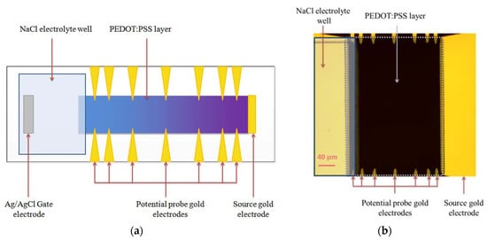 The device consisted of Ag/AgCl gate electrode immersed in a well filled with the NaCl electrolyte with concentration 100 mM; the PEDOT:PSS layer was connected to the electrolyte layer at one side and to the gold Source electrode at the other side. Fourteen probe electrodes were connected to the PEDOT:PSS layer at both sides of the channel to measure the electrical potential at various distances from the source electrode. Thus, the device allows measuring the potential along the channel to compare the experimentally measured potential profile with that which was numerically calculated. The device has the following geometrical characteristics: the thickness of PEDOT:PSS layer is equal to 100 nm, the width—200 µm and the length—200 µm.