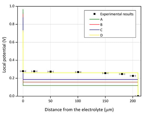 Experimentally measured (marked line) and numerically calculated (straight line) potential profile along the PEDOT:PSS channel. The calculated profiles were computed with various initial hole concentrations: A—1018 cm−3; B—5·1018 cm−3; C—1019 cm−3; D—5·1019 cm−3.