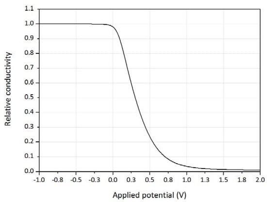 OECT fundamentally differs from field-effect transistors in that the switching mechanism does not initiate through the formation of a thin conducting channel at the semiconductor–insulator interface. Instead, the conductivity of the whole polymer film is changed during the doping–dedoping process. There are several aspects that make modeling of the doping–dedoping process difficult. Basically, conducting polymers are degenerately doped semiconductors, with a density of dopants ranging between 1018 and 1021 cm−3. However, they also behave as ionic conductors. Moreover, the doping–dedoping mechanism involves an electrochemical reaction that occurs in the bulk of the polymer layer [,]. Such a mechanism is difficult to describe with conventional electrochemical models because, in principle, electrochemical reactions take place at the interface between an electrode and an electrolytic solution.