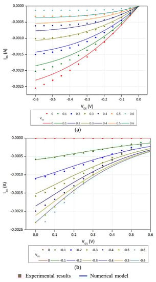 Numerically calculated current–voltage curves for one device were compared with experimental data to check the validity of the 1D model and the possibility to use it for the real device parameter calculations. Calculated and measured output (ID − VDS) and transfer (ID − VGS) curves are drawn in Figure 7. The values of the parameters are gathered in Table 1.