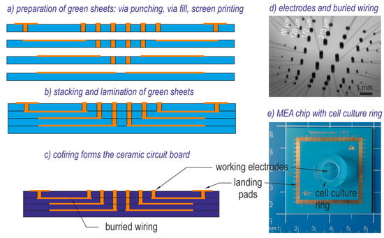 Planar multi electrode array (pMEA) made of low temperature cofired ceramic (LTCC): (a–c) fabrication steps; (a) processing of single green sheets (Green TapeTM 951, via paste 5738, conductor paste 5740A, DuPont); (b) stacking and lamination of the unfired foils; (c) firing; (d) X-ray micrograph of the electrode array showing microelectrodes with different diameter; (e) pMEA chip with mounted cell culture ring.