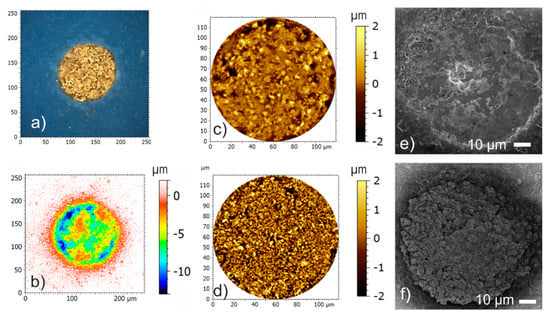 The surface structure of the electrodes was studied with laser scanning microscopy (LSM, Olympus OLS4100, Olympus Europa SE & Co. KG, Hamburg, Germany) and electron scanning microscopy (SEM, S 4800-II, Hitachi High-Technologies Europe GmbH, Krefeld, Germany). The captured LSM data were processed with the software MountainsMap® (Digital Surf, Besançon, France). The real color image of a TFGe is depicted in Figure 2a. A grainy surface structure is visible. For height profile evaluation, invalid measuring points (sparks) were approximated with an adapted curve. Figure 2b depicts the resulting topography graph of a typical TFGe. For roughness calculation, a Gaussian filter (DIN EN ISO 16610-71) with a cut-off length of 8 µm was applied. The resulting area profiles of the roughness are shown in Figure 2c,d. Figure 2e,f present SEM micrographs of a TFGe and a PEDOTe.