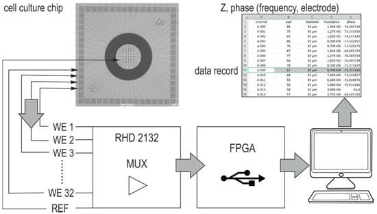 The buried screen-printed conductor lines connect the working electrodes over landing pads with pin contacts on the adapter board carrying the acquisition chip (RHD 2132 from Intan Technologies, Los Angeles, CA, USA). The measurement adapter is described in previous works [2]. It serves for recordings in electroactive cell cultures and provides impedance analysis covering a frequency range between 20 Hz and 5 kHz. The schematic set up in Figure 3 illustrates the information flow. A platinum wire is connected with the reference (REF) of the chip and plunged into the electrolyte. All electrodes are addressed by a multiplexer at a given frequency, and the captured impedance data are transferred to a computer. The single data record contains the position information, frequency, phase, and impedance magnitude. In this way, each electrode can be individually evaluated.