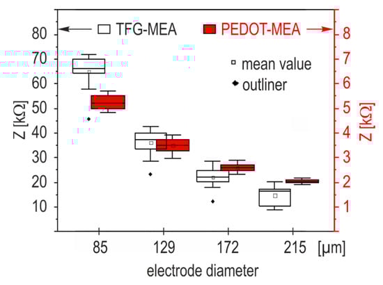 Box plot of impedance magnitude (1 kHz) as a function of the electrode diameter. Planar MEAs with TFGe are referred to as TFG-MEAs. MEA chips with PEDOT are referred to as PEDOT-MEA.