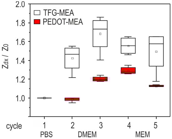 Electrode conditioning allows the electrochemical processes at the electrode surface to reach the equilibrium state. While the impedance characteristic of gold electrodes is dominated by the double layer capacitance [16], ion diffusion is one significant influence on the impedance change of PEDOT coatings [17]. The evaluation of conditioning influences on the electrode impedance provides crucial data for the assessment of the measurement accuracy. Figure 5 depicts impedance data measured at 1 kHz before and after exposure to cell culture media. The values of all measured electrodes in the respective category are compared. Treatment cycles are described in Section 2.3.2. The impedance ratio Zdx/Z0 is standardized to the value measured in cycle 1 (PBS after 4 h storage).