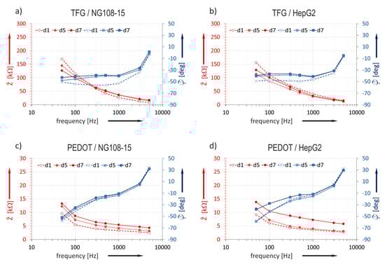 The impedance characteristic was studied over the cultivation time on the base of the daily measured data (Section 2.3.4). The median values of the impedance magnitude and of the phase for data sets measured on TFGe and PEDOTe are presented as bode plots in Figure 6. Data bases are the values of electrodes with 129 µm diameter.