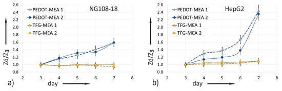 Impedance increase ratio calculated using Equation (1) for TFG-MEAs and PEDOT-MEAs (based on mean values of all electrodes measured at 1 kHz): (a) NG108-15 cell culture; (b) HepG2 cell culture.