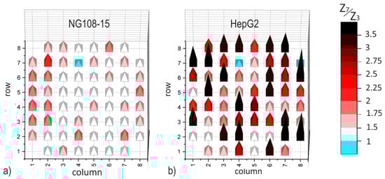 Spatial mapping of the impedance ratio Z7/Z3 (PEDOT-MEAs) measured on single electrodes at 1 kHz: (a) NG108-15 cell culture and (b) HepG2 cell culture.