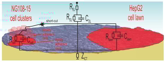 In the case of the well-spreading HepG2 culture, the cell lawn covers wide areas and electrodes, many of them completely. The dense lawn adheres strongly and is not washed away during SEM preparation. The observed impedance increase in Figure 8b is related to the covered electrode area.