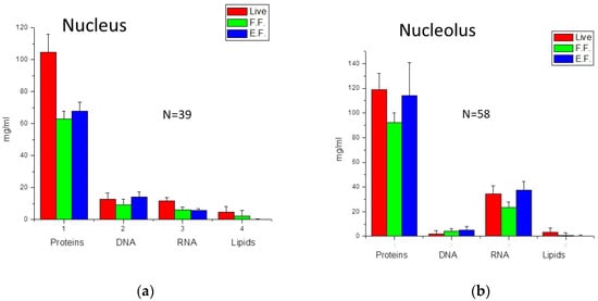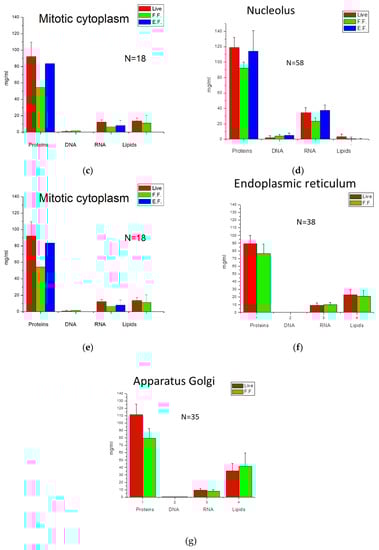 Concentrations of Proteins, DNA, and RNA obtained in different cellular organelles—nuclei (a), nucleoli (b), mitotic cytoplasm (c), mitotic chromosomes (d), mitochondria (e), endoplasmic reticulum (f) and apparatus Golgi (g)—in live and fixed cells. Abbreviations: E.F.—fixed by ethanol, F.F.—fixed by formaldehyde. N shows the number of measured organelles. Error bars show cell-to-cell variations of concentrations.